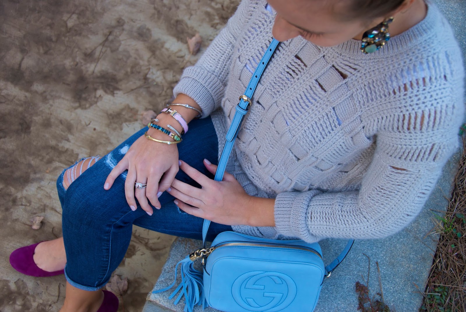 Sweater: BCBG; Jacket and Jeans: Jcrew; Flats: Jcrew; Bag: Gucci