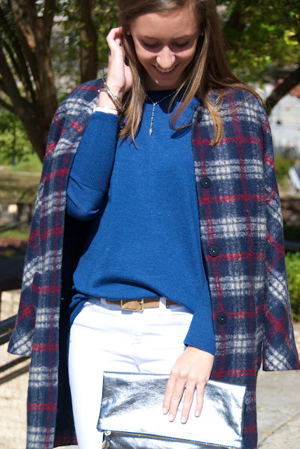Sweater and Jeans: Jcrew; Coat: Madewell; Flats: Zara; Clutch: Clare V.